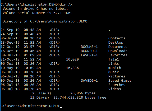 - In a command prompt, cd to the watch set configured in PeerGFS/PeerLink and enter the following command: dir /x