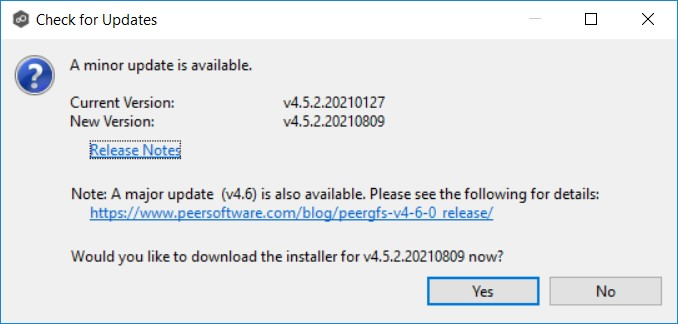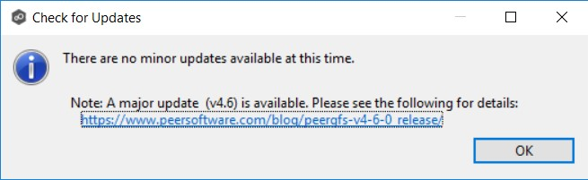 You can check to see whether a new version of PeerGFS has been released by using the Check for Updates functionality within Peer Management Center. If a minor update is available, you can proceed to immediately install the new version. If a major upgrade is available, you must first obtain a new license by submitting the Peer Global File Service Upgrade Form. You should also back up your PeerGFS configuration before installing a major upgrade.