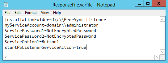 CODEInstallationFolder=D\:\\PeerSync Listener myServiceAccount=domain\\administrator ServicePassword1=NotEncryptedPassword ServicePassword2=NotEncryptedPassword ServiceOption1=Button1 startPSListenerServiceAction=trueCustomize the field values as necessary: