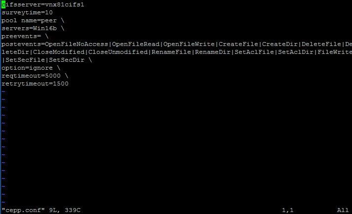 CODEcifsserver=<CIFS Server name> surveytime=10 pool name=peer \ servers=<CEE server name or IP address> \ preevents= \ postevents=OpenFileNoAccess|OpenFileRead|OpenFileWrite|CreateFile|CreateDir|DeleteFile|DeleteDir|CloseModified|CloseUnmodified|RenameFile|RenameDir|SetAclFile|SetAclDir|FileWrite|SetSecFile|SetSecDir \ option=ignore \ reqtimeout=5000 \ retrytimeout=1500where: