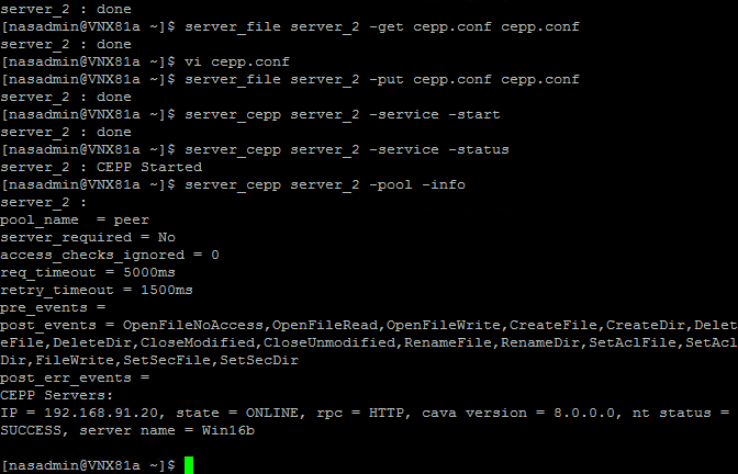 server_cepp <Data Mover name> -service -startVerify that the CEPP service is running and configured correctly by running these two commands: