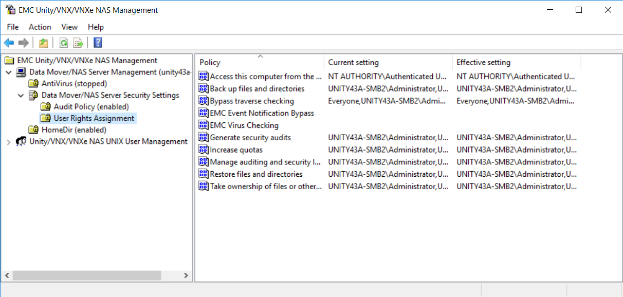 Navigate to the Data Mover/NAS Server Management > Data Mover/NAS Server Security Settings >User Rights Assignment folder.