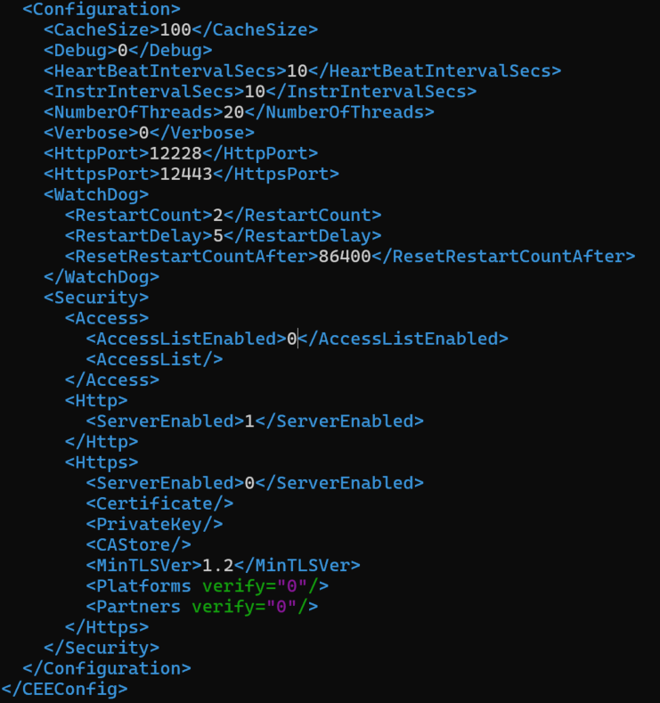 Navigate to the bottom of the xml file, find the Configuration/Security section and set Http/ServerEnabled to 1