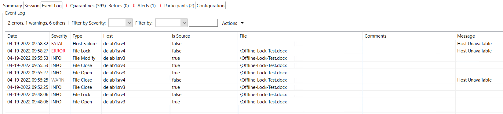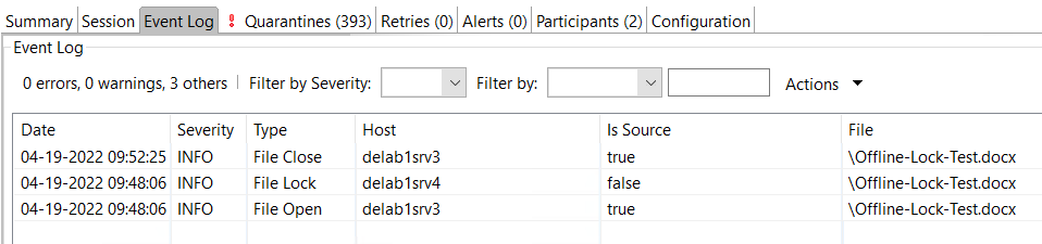 The Offline-Lock-Test.docx file was opened on delab1srv3 and thus was locked on all the other participants. After that, connection between delab1srv4 and the broker was cut off and the file was closed on the source (delab1srv3) for this test. However the file remains locked on delab1srv4 but get released on all of the other participants.