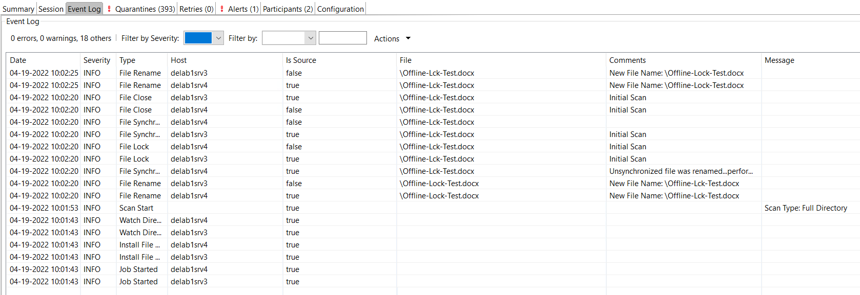 Once changes are made, PeerGFS will try to contact delab1srv4 to push the changes through, but as it is not reachable, it will disconnect that Agent from the collaboration. Once the connection is re-established, the changes will be put through and the lock will be released. As shown below, a scan will be started to compare and match all watch sets again.