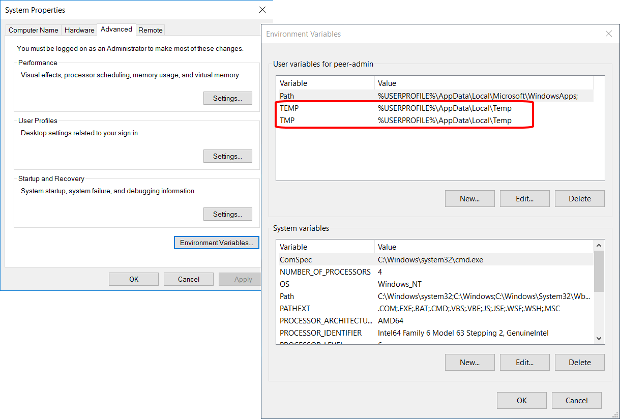 - Determine the location of the TEMP and TMP directories by opening the System Properties window, and in the Advanced tab, clicking Environmental Variables.