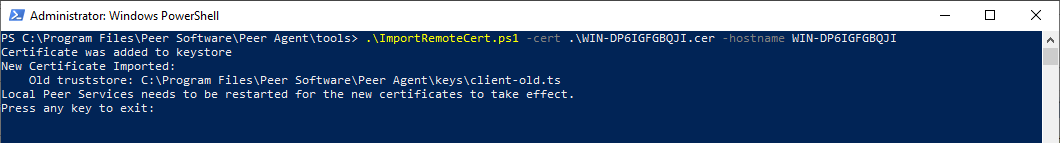 ImportRemoteCert.ps1script is in the current directory or provide the full path to it. Adjust the$hostnameand$certificateFilePathvariables according to your actual hostname and certificate file. For example: