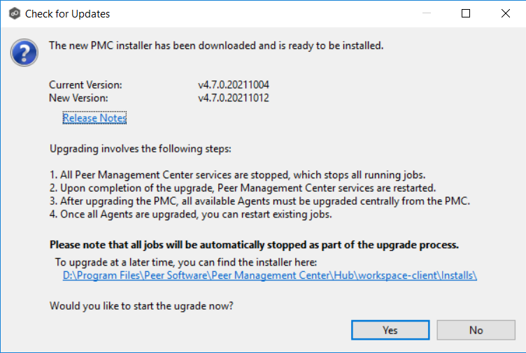 In the Check for Updates dialog, click Yes to download the Peer Management Center (PMC) installer. As the update is downloaded, a progress bar appears in the lower right corner of the Peer Management Center window. The installer is downloaded to the Peer Management Center installation folder (typically C:\\Program Files\Peer Software\Peer Management Center\Hub\workspace-client\Installs\). After the download is complete, the Check for Updates dialog displays information about the update process.
