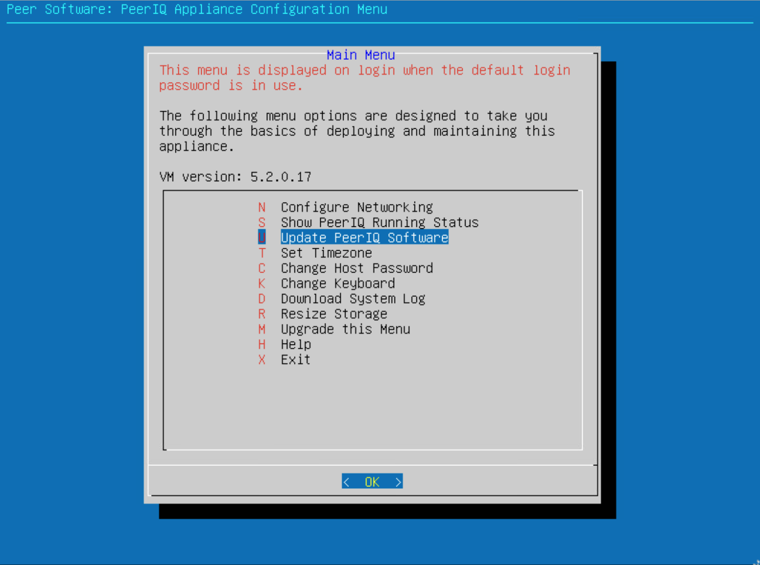 Use the arrow keys to select Update PeerIQ Software from the menu or press the U key, and then press the Enter key.