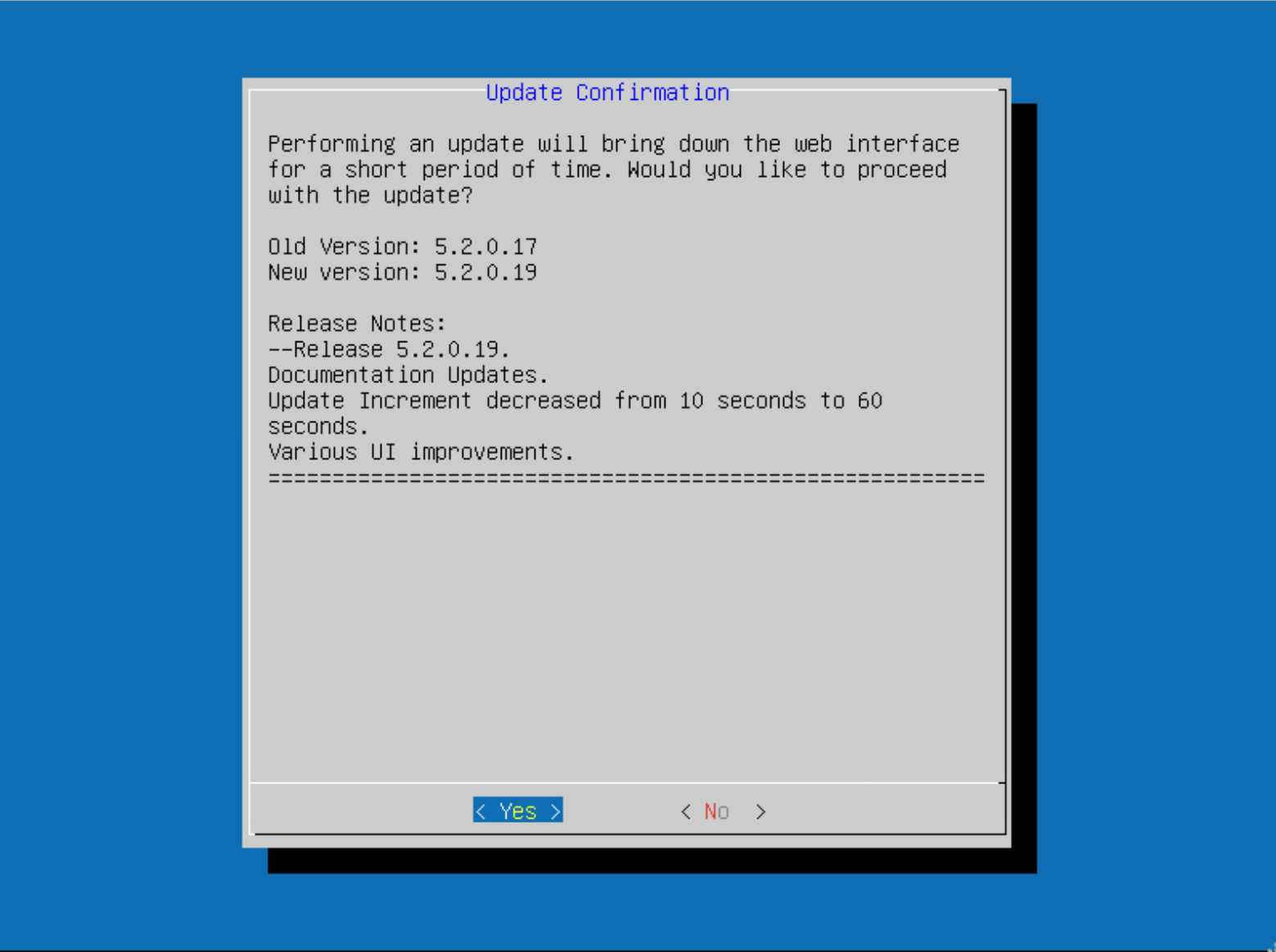 If an update is available, it will be displayed along with the release notes. Use the arrow keys to select Yes, and then press the Enter key. If no upgrade is available, just press the Enter key.
