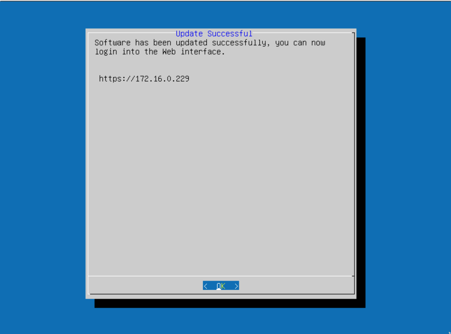 The status of the software update will be presented along with the IP address of the PeerIQ web interface. Press the Enter key to exit the update menu.