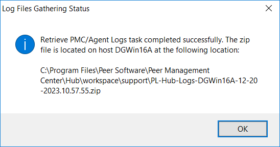 The PMC and Agent logs are automatically retrieved and uploaded to Peer Software Support. If you haven't already logged a case, you can do so using the Peer Software Service Desk.