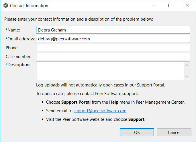 - Enter the Peer Service Desk case number if you have one (for example, PEERSD-8545); this attaches the logs to your case.