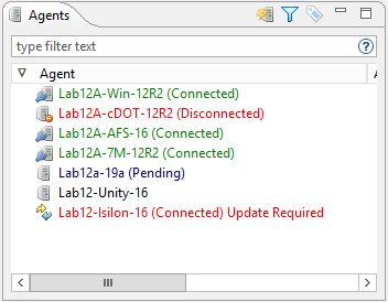 (Connected) Update Required | Red | This version of the Agent is not the one required by the PMC. The version is displayed in the Version column in the Agents view. The Agent must be updated to the required version before the Agent can be used in jobs. |