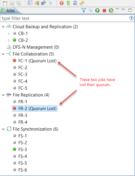 - The job will remain stopped until restarted. When the job successfully restarts, the Quorum Lost label will disappear.