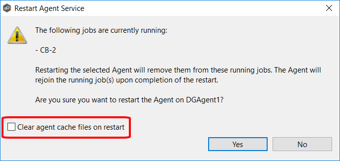 When restarting an Agent, you have the option to clear the Agent cache. This will delete all of the .jar files stored in this folder and force them to be re-downloaded on the next command that requires them. You may want to do this when system functionality is impaired due to corrupted files that need to be be cleared out.
