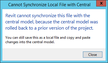 When an RVT file is quarantined, changes to the model will no longer be synchronized until the quarantine is resolved. Associated work sharing files that are located in the ModelName_backup subdirectory will continue to be synchronized. Therefore, if users continue to work on the RVT model while it is quarantined, ownership changes will cause the work sharing files to get updated and ultimately synchronized by Peer Global File Service. Depending on the changes that users make, they may or may not be allowed to complete those actions since the model will become outdated. In those cases, Revit will detect the file is out of date and display a message (typically when they try to Sync to Central):